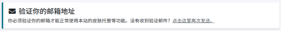 教程 注册 皮肤站 账号 阅读此文章前,先阅读 游玩教程 本篇文章将引导您在我们的皮肤站注册一个账号 前往注册页面后,如果一切正常,你将会看到这样的注册页面: 填写时,您必须遵守下方的要求。 栏目 要求 电子邮箱 格式严格按照QQ号@qq.com 密码 至少8位 重复密码 同密码 游戏内角色名 大小写字母数字下划线 验证码 / 提示注册成功后,应会在主页提示验证你的邮箱地址,如下图: 您必须完成邮箱验证,才能继续使用皮肤站的服务。 注册完毕后,请回到 游玩教程 继续。